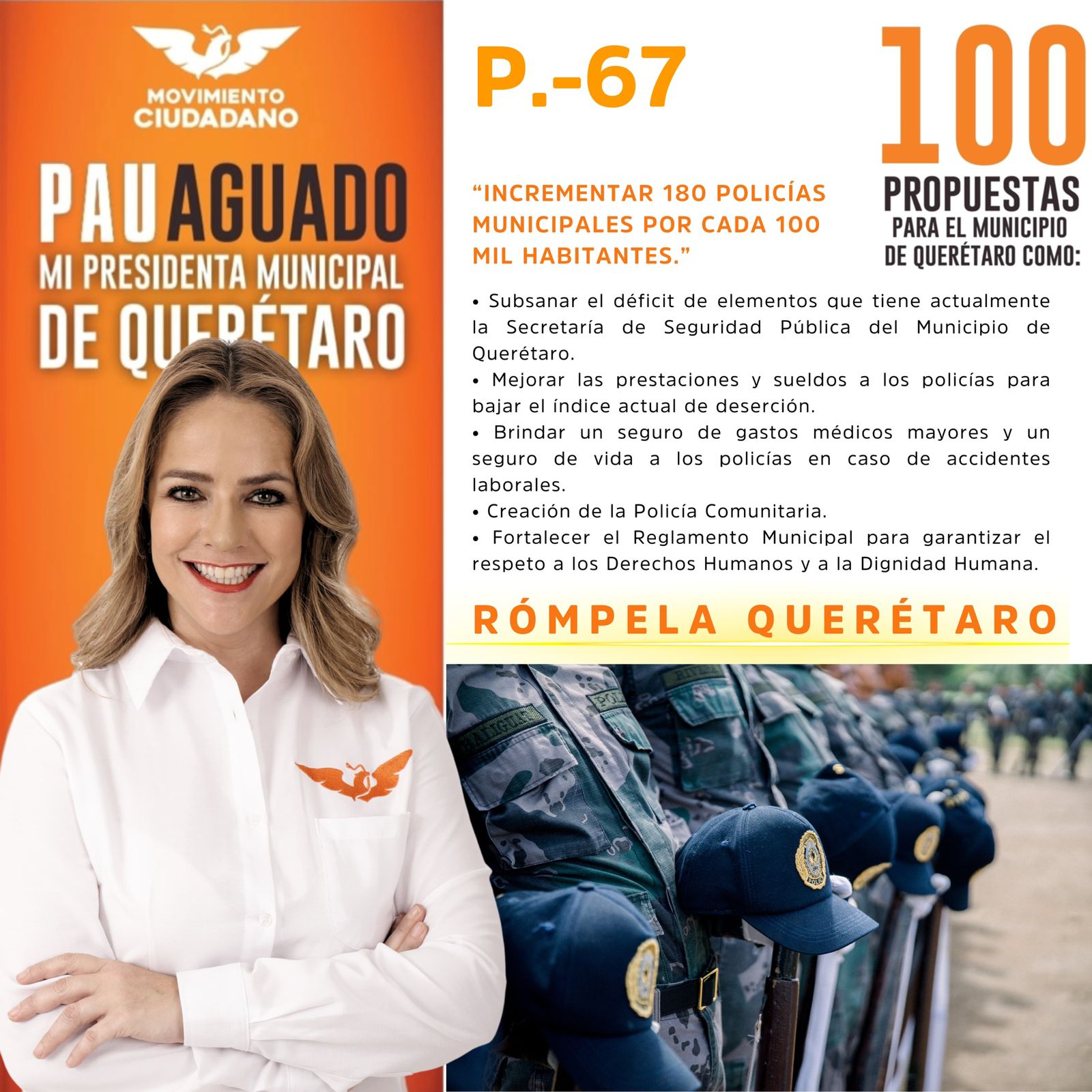 Paulina Aguado Romero, candidata a la presidencia municipal de Querétaro por Movimiento Ciudadano, propuso incrementar la policía municipal a 180 policías por cada 100 mil habitantes