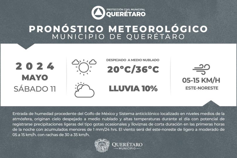 36ºC, vientos de 05 a 15km/h y rachas de hasta 35km/h.